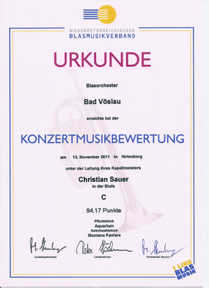 Das Blasorchester Bad Vöslau erreichte mit 94,17 Punkten die Tageshöchstwertung und erspielte sich somit wiederum einen „Ausgezeichneten Erfolg“ beim Konzertwertungsspiel des Niederösterreichischen Blasmusikverbandes.