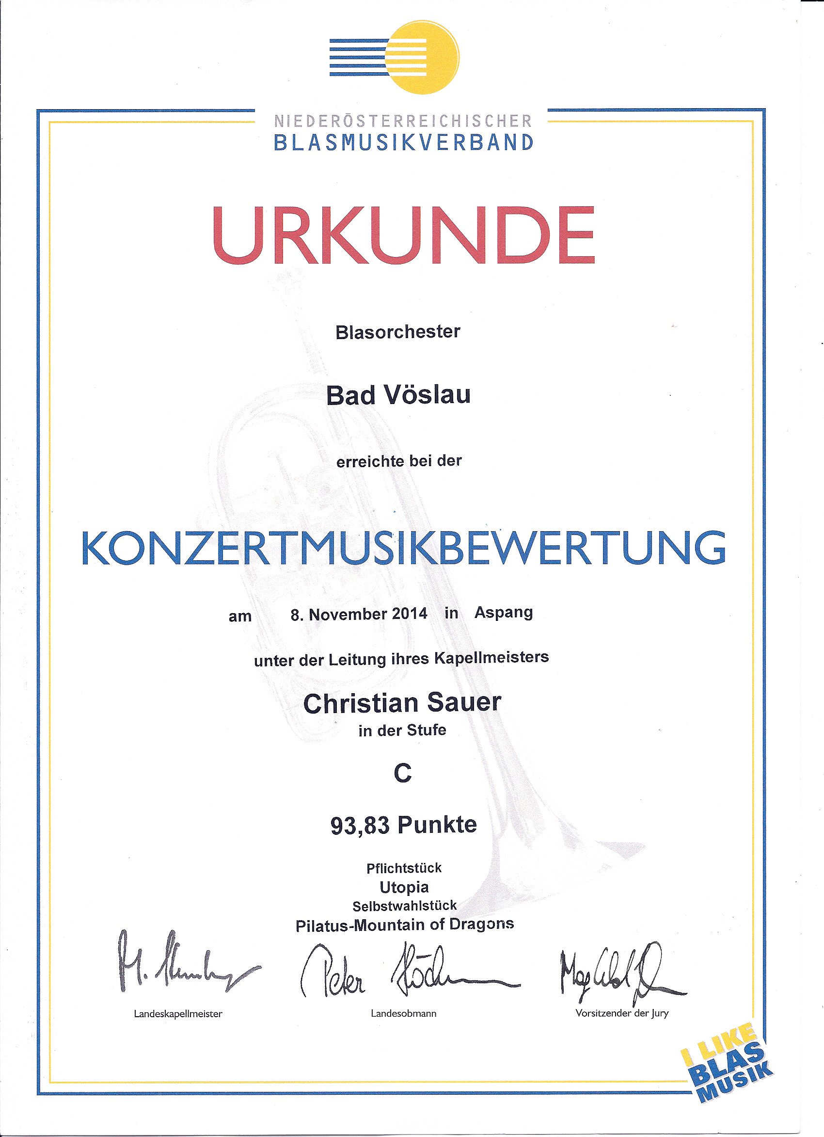 Unter der musikalischen Leitung von Kapellmeister Christian Sauer trat das Blasorchester Bad Vöslau in der Schwierigkeitsstufe C an und errang dabei mit dem Pflichtstück „Utopia“von Thomas Asanger und dem Selbstwahlstück „Pilatus: Mountain Of Dragon“ von Steven Reineke 93,83 Punkte und somit die Tageshöchstnote.