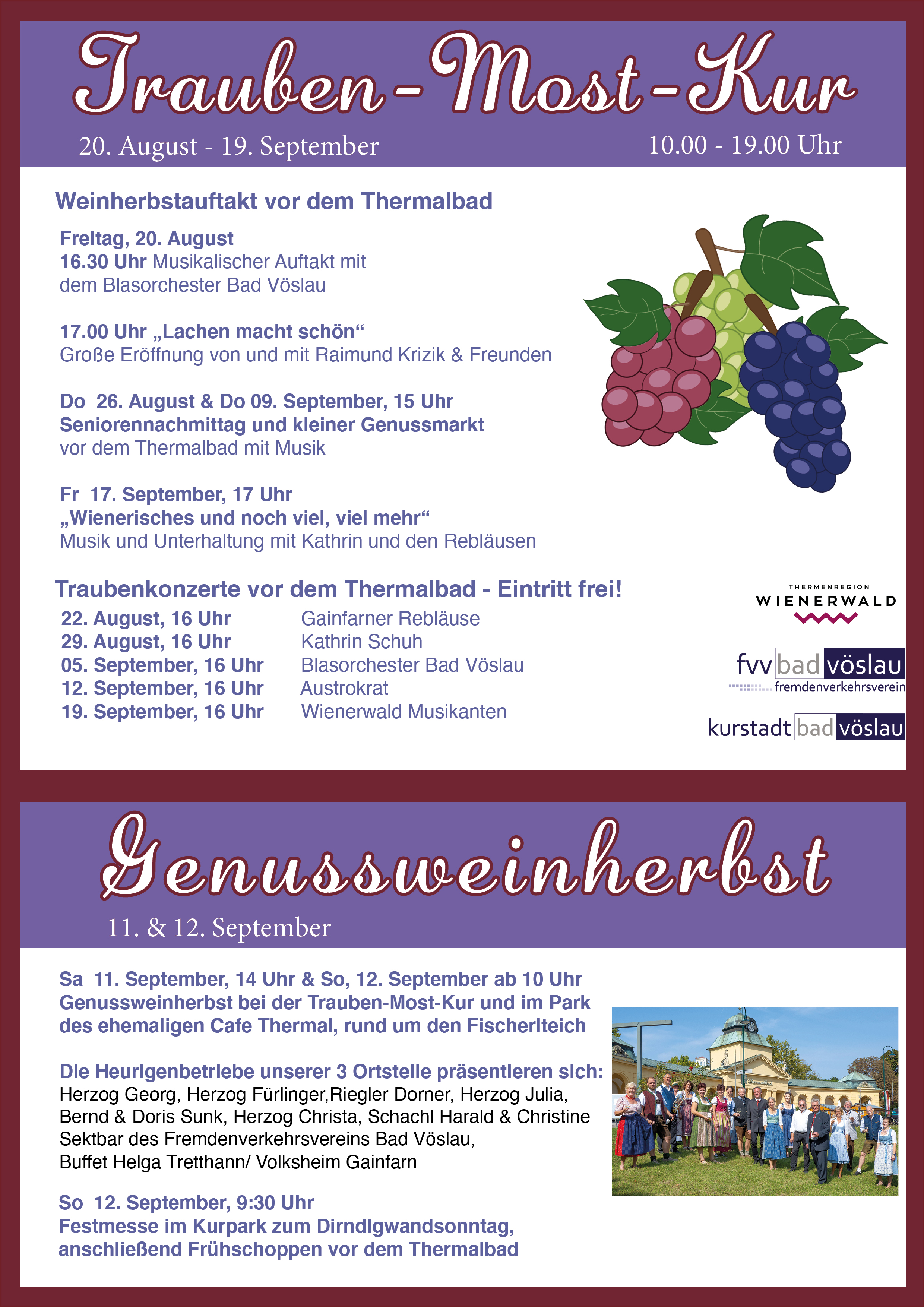 Der Weinherbst beginnt mit der Eröffnung der Trauben-Most-Kur am 20. August 2021 um 16.30 Uhr mit dem Blasorchester Bad Vöslau und dauert bis 19. September 2021.