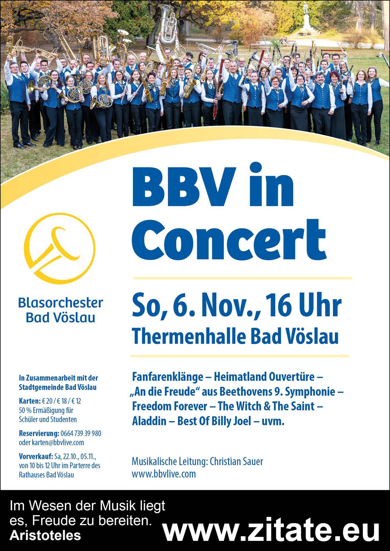 Freuen Sie sich auf einen abwechslungsreichen und unterhaltsamen Konzertnachmittag mit dem BBV in der Vöslauer Thermenhalle und reservieren Sie sich rechtzeitig Ihre Karten unter Tel. 0664-739 39 980 oder per Email unter karten@bbvlive.com Konzertkarten zum Preis von € 20,-/18,-/12,- (Schüler & Studenten 50 % Ermäßigung) sind auch an den Samstagen 22. Okt. und 05. Nov. 2022 von 10 bis 12 Uhr im Parterre des Rathauses Bad Vöslau erhältlich.