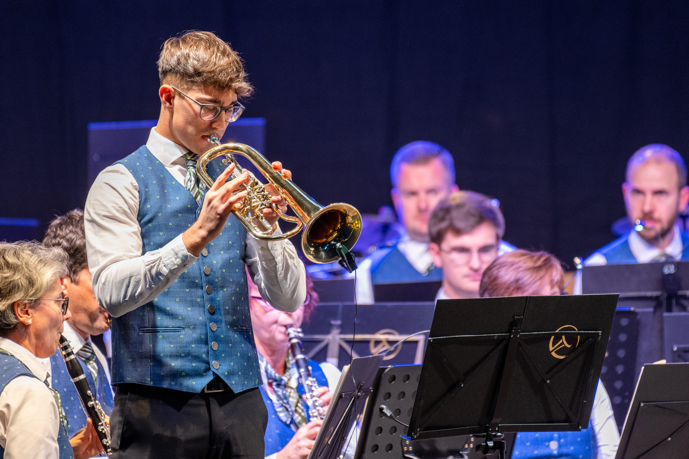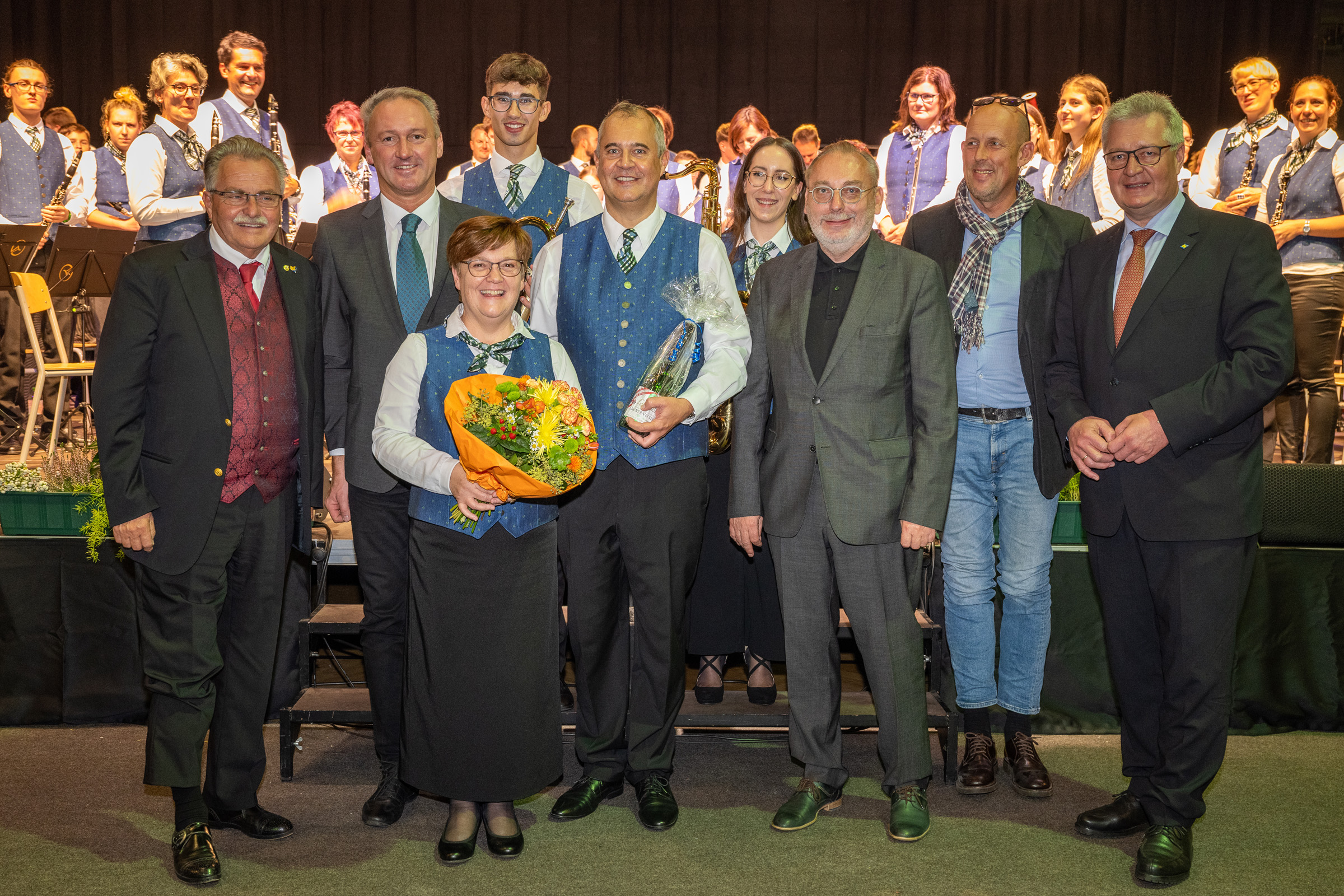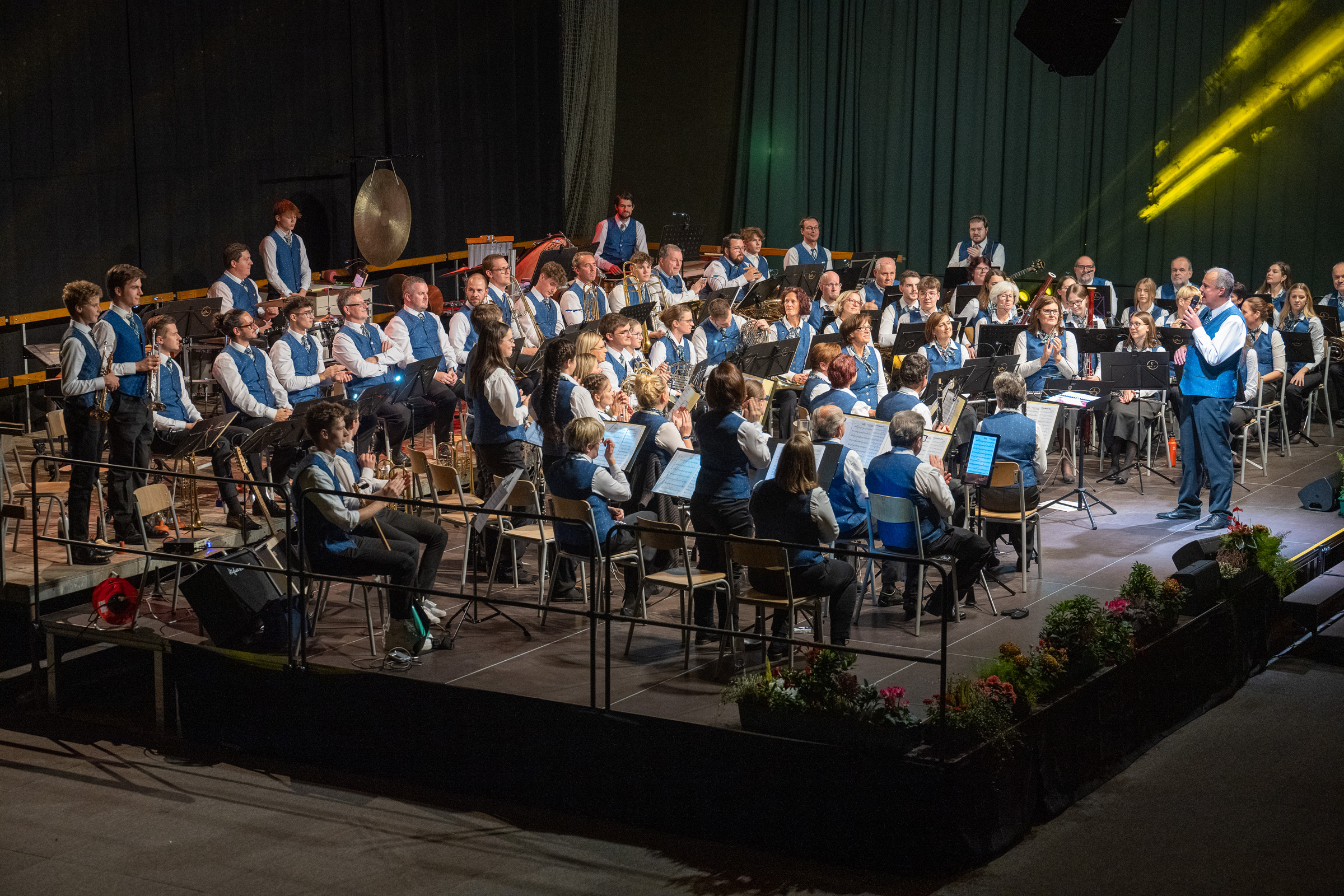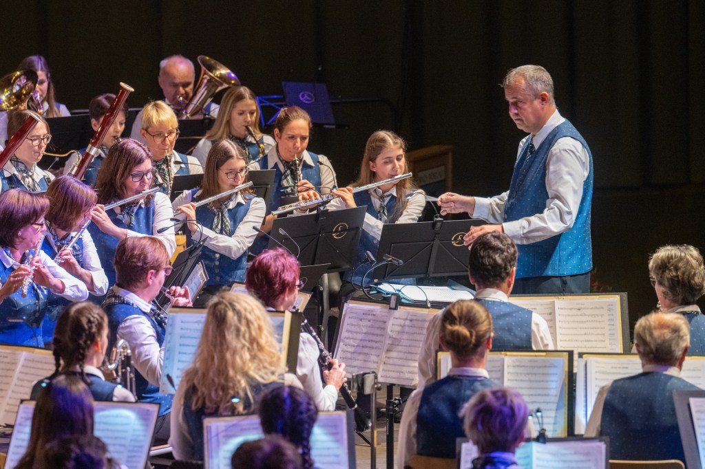 Unser musikalischer Leiter Christian Sauer hatte auch heuer wieder ein sehr ab-wechslungsreiches und breitgefächertes Konzertprogramm für unser Publikum vorbereitet. Eröffnet haben wir das Konzert mit dem festlichen Marsch „Fanfarenklänge“ von Julius Fučik. Danach erklang die schwungvolle „Heimatland Ouvertüre“ des tschechischen Komponisten Jundřich Praveček, die auch das Pflichtstück beim Konzertwertungsspiel in Hirtenberg war. Bei der anschließenden „Mondscheinsonate“ von Beethoven beeindruckte Jacob Sauer als Flügelhornsolist mit seiner gefühlvollen Interpretation der berühmten Melodie. Danach präsentierten wir unserem Publikum die „Ode an die Freude“ aus der 9. Symphonie (Europahymne) von Ludwig van Beethoven als musikalisches Zeichen für Friede und Freiheit. Das Werk „Freedom Forever“ des Pottensteiner Komponisten Günther Fiala wurde vom anwesenden Komponist persönlich vorgestellt wurde. In diesem Stück geht es um die Chancen und Möglichkeiten, die sich durch die Freiheit ergeben. Höhepunkt vor der Pause war das programmatische Stück „Die Hexe und die Heilige“ von Stefen Reinecke. Es erzählt die Geschichte der beiden Zwillingsschwestern Sybilla und Helena gegen Ende des 16. Jahrhunderts. Das Publikum war von diesem sowohl dramatischen aber auch sehr feinfühligen Stück sichtlich berührt.