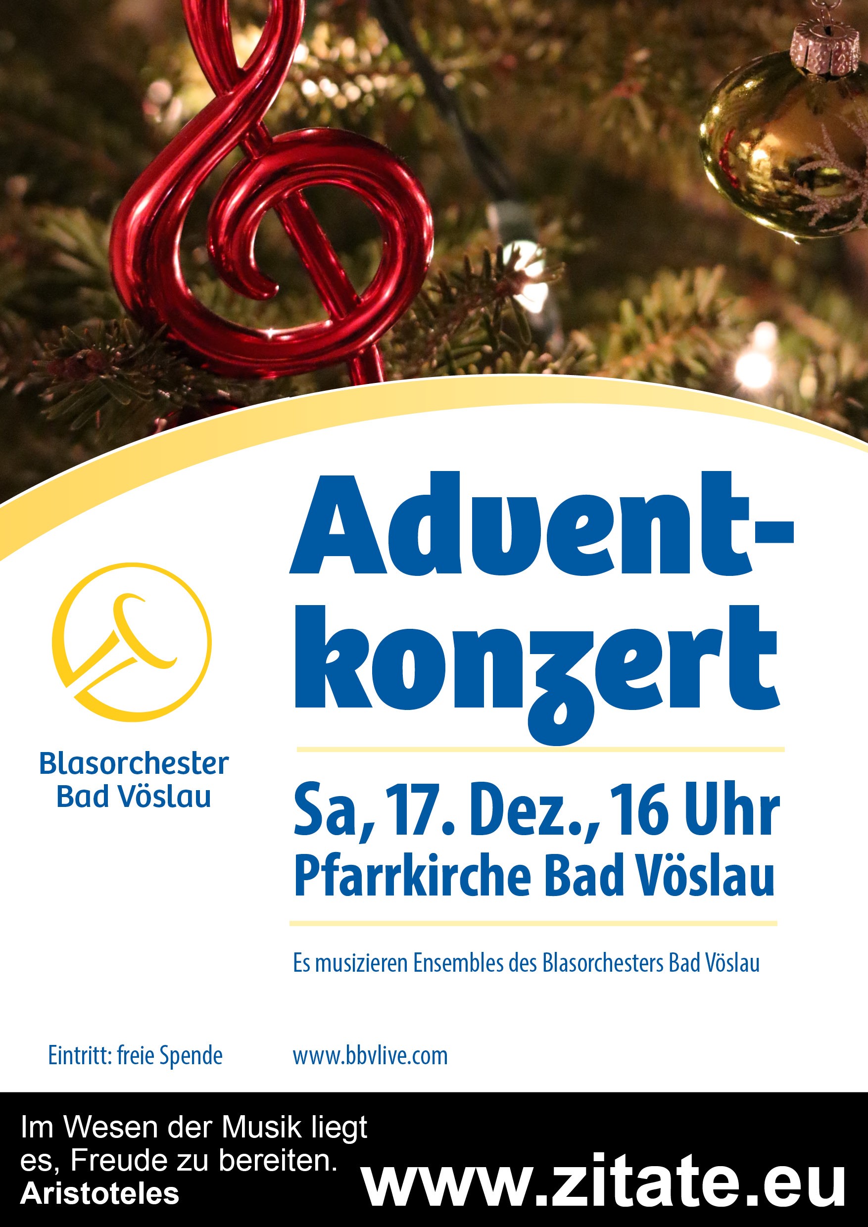 Das Blasorchester Bad Vöslau lädt zum stimmungsvollen Adventkonzert in die Pfarrkirche Bad Vöslau. Bei diesem Konzert werden verschiedene Ensembles des Orchesters mit einem abwechslungsreichen musikalischen Programm auf das bevorstehende Weihnachtsfest musikalisch einstimmen. Neben instrumentaler Adventmusik wird auch das eigens dafür zusammengestellte BBV Vokalensemble mit Adventliedern für vorweihnachtliche Atmosphäre in der Vöslauer Pfarrkirche sorgen.