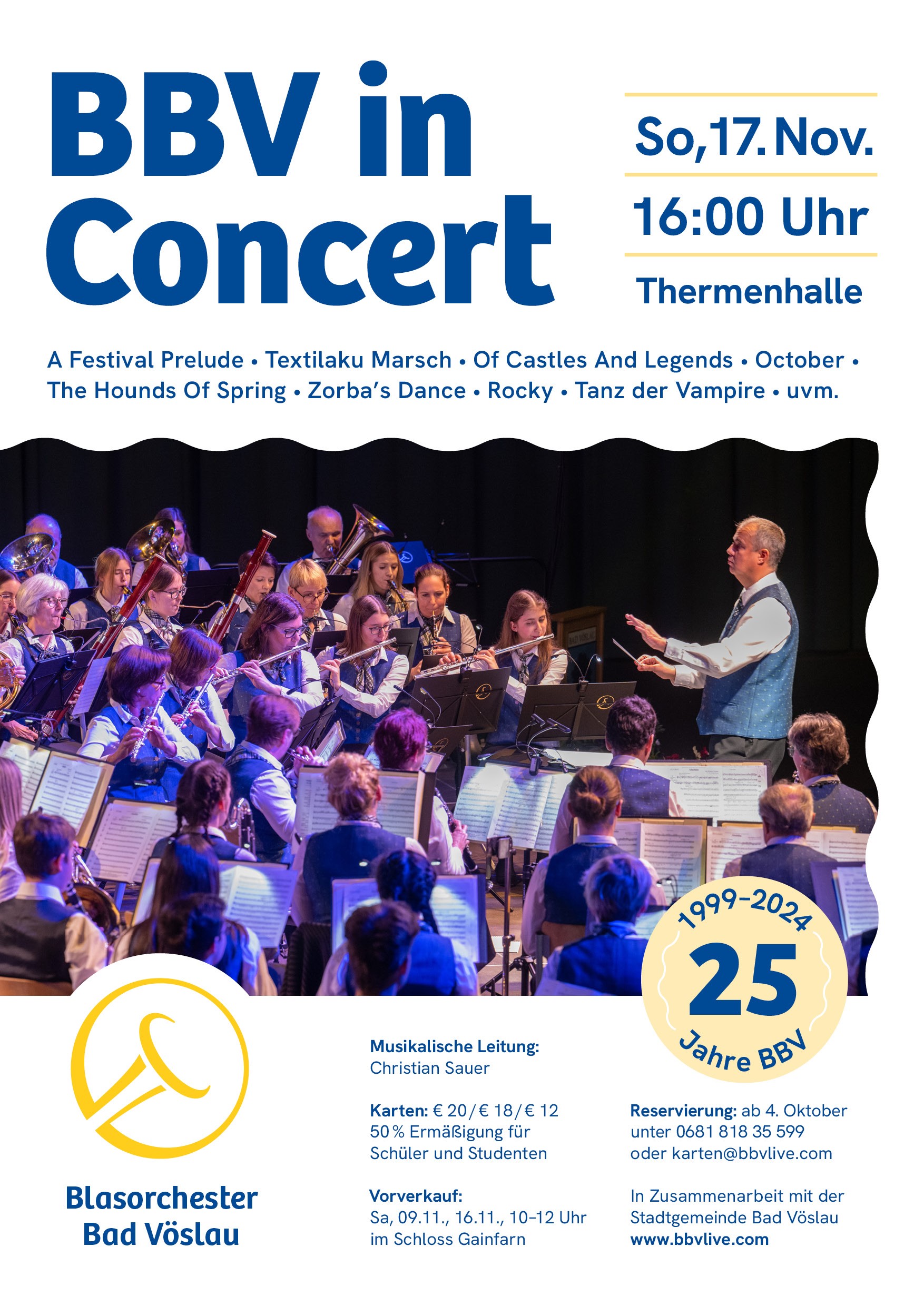 Der musikalische Höhepunkt unseres Vereinsjahres ist auch heuer wieder unser großes Herbstkonzert „BBV in Concert“, das diesmal ganz unter dem Motto „25 Jahre BBV“ steht.