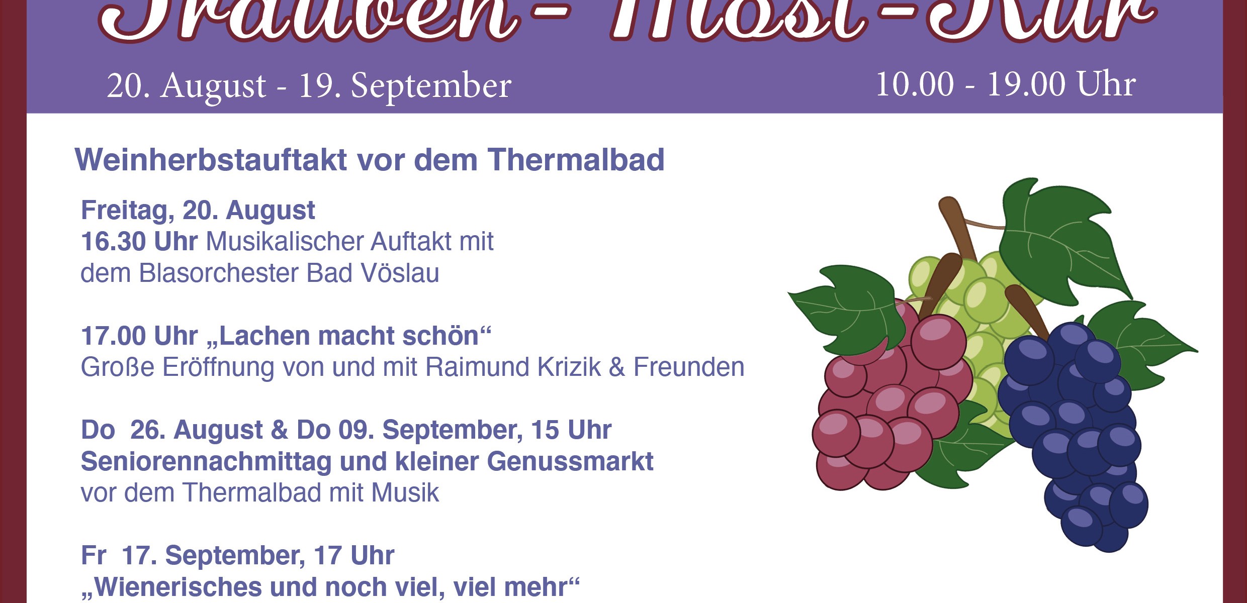 Die Weinherbstwoche und die Trauben-Most-Kur sind ein „gesunder Höhepunkt” in Bad Vöslau. Die ersten Weintrauben, frischer Traubenmost und auch Sturm werden einen Monat lang vor dem Thermalbad präsentiert. Der Weinherbst beginnt...