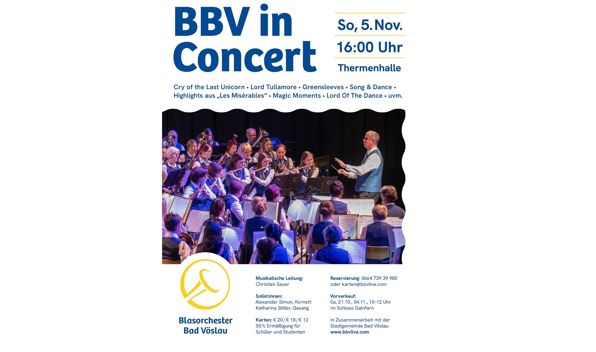 Unter dem Motto „Magic Moments“ lädt das Blasorchester Bad Vöslau heuer am Sonntag, 5. November (Beginn: 16.00 h) wieder zu seinem beliebten Herbstkonzert „BBV in Concert“ in die Vöslauer Thermenhalle. Unter der musikalischen Leitung unseres Kapellmeisters Christian Sauer werden wir ein sehr breitgefächertes Konzertprogramm darbieten. Höhepunkte des 1. Programmteils sind Musikstücke aus Irland wie „Lord Tullamore“, „Greensleeves“, oder die bekannte irische Tanzmusik „Lord Of The Dance“. Der zweite Teil steht mit Stücken… Weiterlesen
